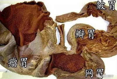 反芻動(dòng)物采食一般比較匆忙,特別是粗飼料,大部分未經(jīng)充分咀嚼就吞咽進(jìn)入瘤胃,經(jīng)過瘤胃浸泡和軟化一段時(shí)間后,食物經(jīng)逆嘔重新回到口腔,經(jīng)過再咀嚼,再次混入唾液并再吞咽進(jìn)入瘤胃?梢允怯闪鑫钢苯幽鎳I上行至口,也可以從瘤胃陸續(xù)進(jìn)入網(wǎng)胃,再由網(wǎng)胃返回口中,經(jīng)口腔中頰齒的細(xì)細(xì)咀嚼后再次咽回瘤胃。這一反芻和咀嚼過程可以再次重復(fù)進(jìn)行,直至徹底嚼碎后,食物再?gòu)牧鑫附?jīng)網(wǎng)胃而入瓣胃。瓣胃近球形,內(nèi)壁有許多平行的葉片(故俗稱百葉)。瓣胃的葉片提供廣大的面積,食糜在葉片間受到壓擠,使成更細(xì)碎的食糜,同時(shí),瓣胃也吸收一部分水和低級(jí)脂肪酸。皺胃是唯一分泌消化液的部分,相當(dāng)于其它獸類的胃本體,胃腺的分泌物中含有胃蛋白酶和鹽酸 。