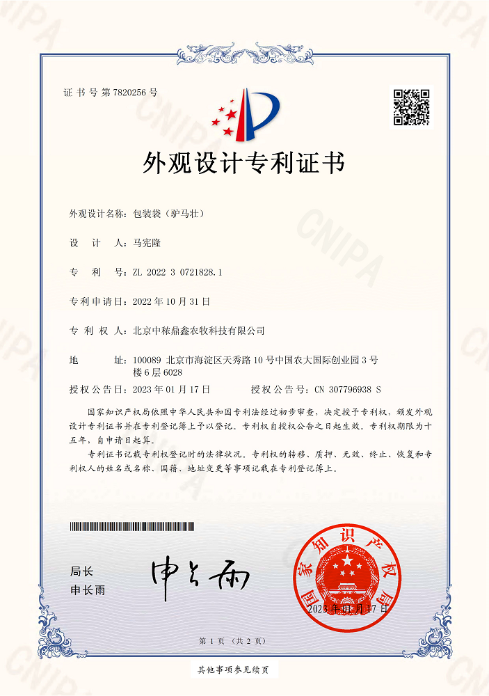 驢馬壯外觀設(shè)計專利證書